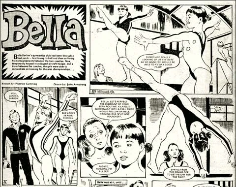 "Bella at the Bar" (also known as "That Barlow Kid", or simply "Bella") was a strip that ran in Tammy, drawn by John Armstrong, from 1974 to 1984. Writers included Jenny McDade, John Wagner, Primrose Cumming and Malcolm Shaw.[1] Its main character was a wee lass named Bella who was into gymnastics. She lived an unhappy life with her uncle and aunt, helping her uncle's work as a window cleaner without pay. She often used her gymnastic abilities to fight injustice. A strip in the 1977 Tammy annual (written by Primrose Cumming)[2] sees her whacking a bully with a ladder after he taunts a young male ballet dancer.