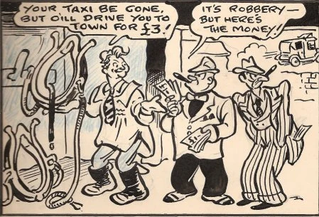 Albert Thacker "Bertie" Brown was born on 20 December 1887 in Epsom, Surrey. His first published work was for James Henderson & Sons' Scraps, and he became a staff artist for the Amalgamated Press in 1908. His first original set was "Homeless Hector" for Illustrated Chips, and he also worked for Merry and Bright, Comic Cuts and Butterfly. From 1915 he drew a Charlie Chaplin strip for Funny Wonder, which ran on the front page until 1944, mostly drawn by Brown, occasionally by Freddie Adkins. Other strips he drew include "Pa Perkins and Percy" (Illustrated Chips, 1922-1958), "Dad Walker and his Son Wally" (Larks, 1927-1940), "Constable Cuddlecook" (Jester, 1920s-1940), "Smiler and Smudge" (Butterfly, 1926-1940) and "Will Hay" (Jolly Comic). In the 40s he drew numerous strips based radio personalities for Radio Fun, and in the 50s he added work for Film Fun and TV Fun as well. His work was initially influenced by Tom Browne and G. M. Payne, but later became looser and sketchier. He retired in 1959, and died in Croydon, Surrey, in 1974.
