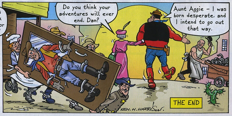 The last panel from the "Desperate Dan" strip in the final print issue of The Dandy, drawn by Ken Harrison.