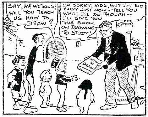 In 1933 he turned his hand to comic strips, drawing strips for The Rover Midget Comic, a free comic supplement given away with The Rover, followed by The Skipper Midget Comic the following year. His first regular comic strip, "Percy Vere and his Trying Tricks", a six-panel strip about an inept magician, appeared in Adventure in 1935 and ran for nearly two years, after which he created "Wandering Willy the Wily Explorer". In 1936 Thomson launched a comic supplement to the Sunday Post, for which Watkins and writer/editor R. D. Low created two regular strips with dialogue in Scots vernacular, The Broons, about a working-class Scottish family, and Oor Wullie, about a mischievous nine-year-old boy, both of which are still running, albeit drawn by other artists.