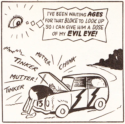 "Evil Eye" was a strip that first appeared in issue one of Whoopee!,[1] and moved to Whizzer and Chips after the two comics merged. It was originally drawn by Reg Parlett.