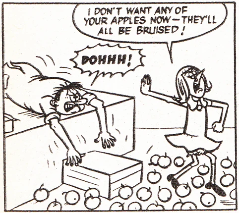 "Fuss Pot" was a strip that first appeared in issue one of Knockout, dated 12 June 1971; it later moved to Whizzer and Chips after Knockout ended. It was drawn by Norman Mansbridge.[1]