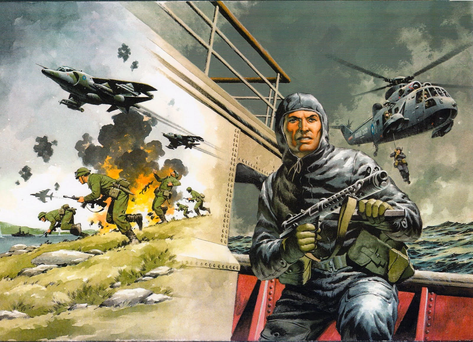 In the 1970s and 80s he joined the science fiction trend, drawing "M.A.C.H. 1" and "Judge Dredd" for 2000AD, "Timequake" for Starlord, "Dan Dare" for the revived Eagle, "Turbo Jones" for Wildcat, Marvel UK's short-lived Blake's 7 comic, and covers for Starblazer. But his first love remained aviation, and in the late 1980s and early 1990s he paintee covers for the annual RAF Leachaurs Air Show programmes. He has been semi-retired since 1997, but still works a couple of mornings a week painting covers for Commando - he has produced over 1200 of them - and occasional one-page features on warplanes for the inside back cover.