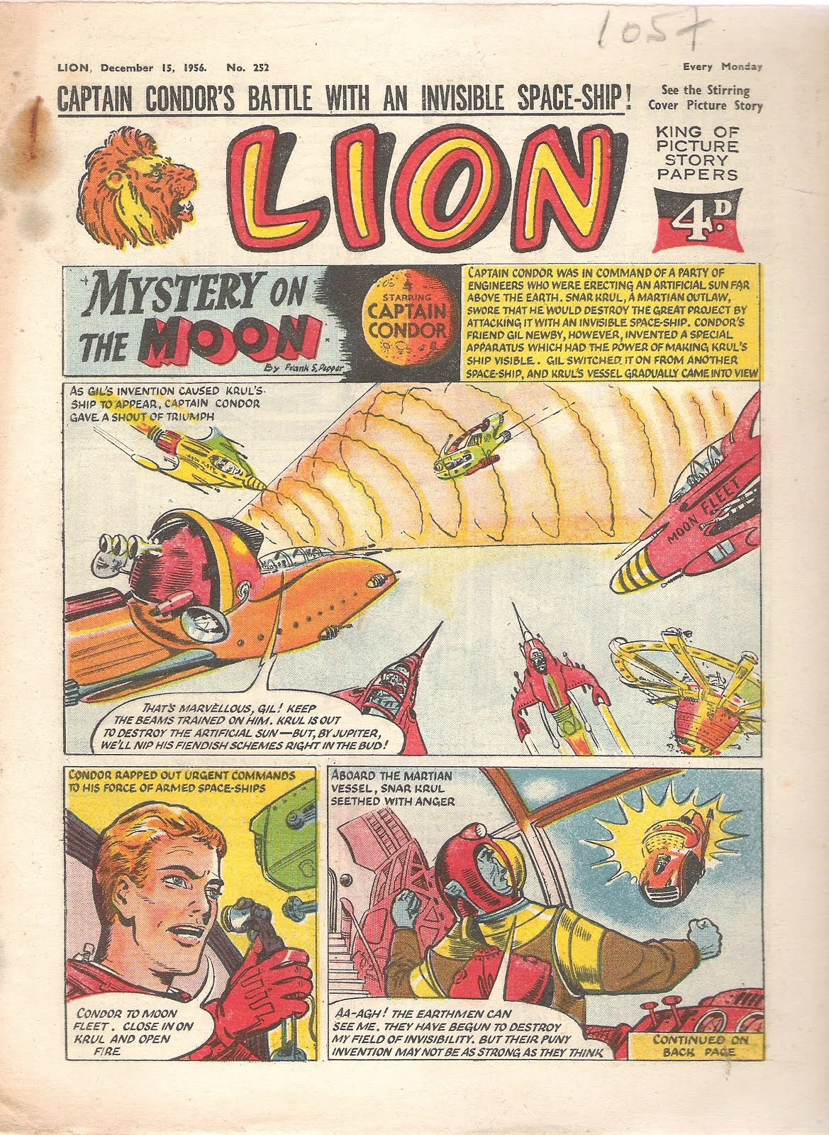 Its original cover star was Captain Condor, star of Outlaw in Space, scripted by Frank S. Pepper and drawn by Geoff Campion, Ronald Forbes, Brian Lewis, Keith Watson and John Gillat. In 1957 this spot was taken by Paddy Payne, by Ted Cowan, Mark Ross, Gino D'Antonio and Joe Colquhoun.