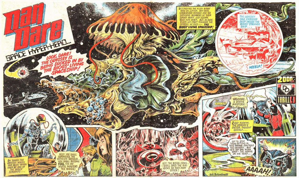 In the mid-70s he drew "Rat Pack" for Battle Picture Weekly and "Death Game 1999" and "Green's Grudge War" for Action. When 2000 AD was in preparation in 1977, he tried out for the revamped "Dan Dare" and got the gig - and the rare honour (in those days) of a byline. While his take on the hero was not popular with fans of the original, his episodes were distinguished by his bizarre imaginings of alien creatures, landscapes and spaceships. Within a year he switched strips with Dave Gibbons, drawing the "Harlem Heroes" sequel "Inferno" while Gibbons took over "Dare". Belardinelli then drew the second series of "Flesh", in which the time-travelling meat-farmers moved into the prehistoric oceans, in 1978-9.