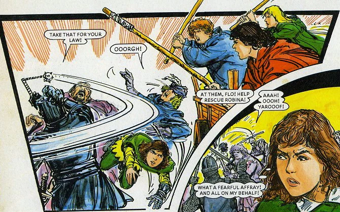 "Robina Hood" was a strip that ran in Bunty. It was set at a time when Robin Hood and his merry men had grown old and retired, with their daughters carrying on the family business.