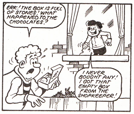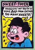 "Sweet Tooth" was a strip that originally appeared in the 6th January 1973 issue of Whizzer and Chips, and moved to Buster after the former comic was cancelled. It was originally drawn by Trevor Metcalfe, with Jim Crocker and Vic Neill later filling in.[1]